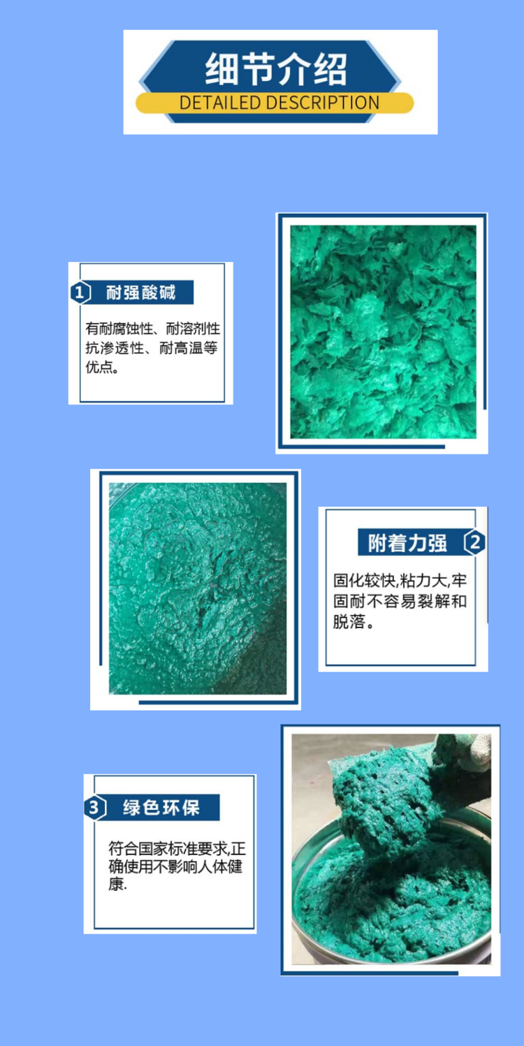 環(huán)氧玻璃鱗片膠泥以環(huán)氧樹脂為基料,玻璃鱗片、防銹填料、胺加成物固化劑組成的雙組份。耐酸玻璃鱗片漆膜抗?jié)B透性好、堅韌耐磨、機(jī)械強(qiáng)度高,抗震抗裂性好。