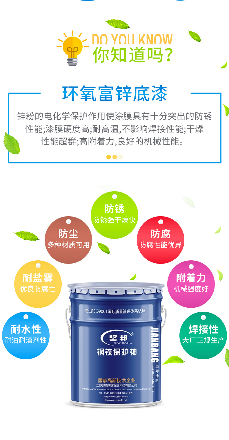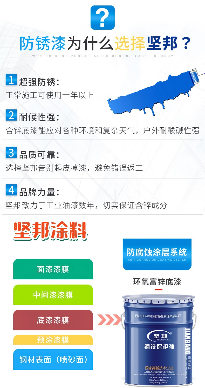 環(huán)氧富鋅底漆以環(huán)氧樹脂為基料,超細鋅粉、聚酰胺固化劑組成的雙組份富底漆。環(huán)氧富鋅底漆的漆膜具有陰極保護作用、防銹、附著力強