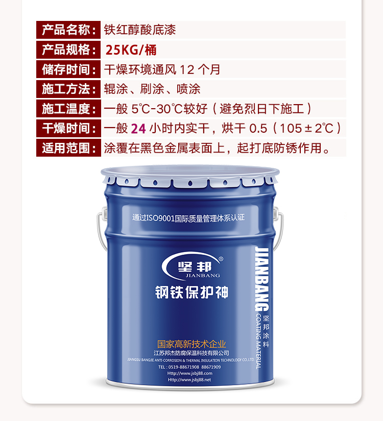 醇酸鐵紅底漆以中油度干性植物油改性醇酸樹脂為基料的防銹漆,不含鉛,無毒性具有良好的附著防銹性能及耐硝基性能,