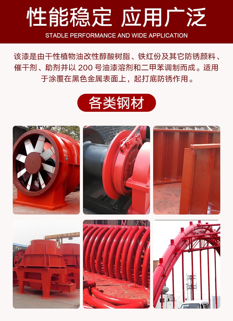 一般氣候條件下耐久性好。醇酸鐵紅底漆用于船舶水線以上及陸上鋼結(jié)構(gòu)作底漆等